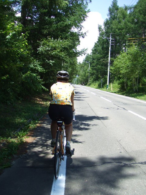 ●最初の登り「大平(おだいら)」交差点(ここで左折)までは2km。道の駅の前からいきなり8%からところによってはそれ以上の急傾斜がとぎれなく続く。ここではインナーローで時速8km台をキープし、負荷が上がりすぎないように配慮する。真理子さんはトリプルギヤのインナーローを動員、もう少し速く走れそうだったが、あとのために自重してもらった。おだいらからはぐっと楽になり、最大5%程度の登り傾向の高原道路。