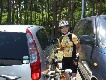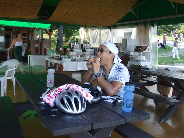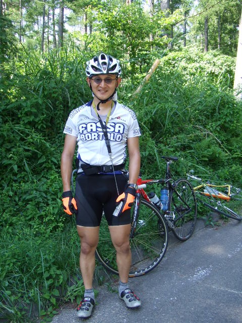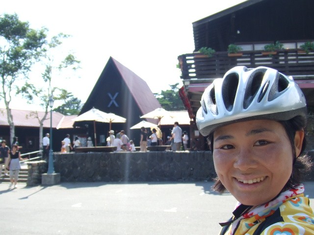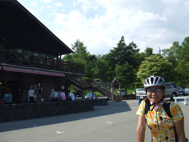 ●清泉寮到着。43.2km、14時45分。空腹に耐えようやく到着し、二人とも安堵した(写真有り)。ここで今回の目玉のソフトクリーム・とうもろこし、さらにホットドッグを食べて腹ごしらえし一服。晴天で本当に気持ちが良い!出発は15時37分。清里までのまっすぐな急坂を矢のように下る。路面はやや荒れているので慎重に。