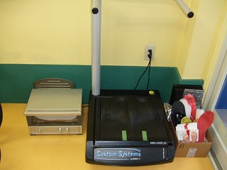 加熱すること約2分、暖まってテロテロに柔らかくなったインソールを成型器に載せて(踏むところは熱くはないのです)、片足ずつ順に乗ってもらいます。 |