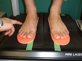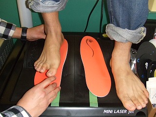 お客さんに成型器の上に乗ってもらって、成型の予備作業をします。各人の足型や体重などを勘案して立ち位置をあらかじめ決めておきます。 (この前に専用台を使用して足型の傾向をチェックします。) |