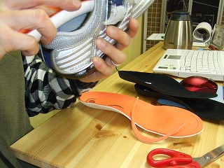 待つこと4〜5分、インソールが冷えて形状が固定したら今度はカットです。用意した靴の内側の形状に合わせて慎重にカットします(今回は最初に入っていたインソールを参考にしました)。 |