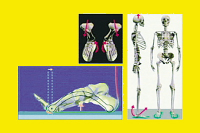 歩行時の足の動きの分析から、足はゆらゆら左右に揺れるような軌道をとって足裏の各部が順次着地し、その過程で衝撃を分散させていることがわかっています(あおり歩行)。そのためシダスでは足の左右への安定性を高め足の動きを妨げずにサポートすることで、足の本来持っている衝撃吸収能力を働かせることを目指しています。
