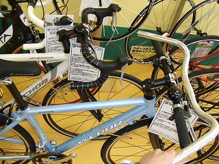 写真のように最新のフルアルミ製クロスバイクにあわせてみても意外なほどバランスのよい姿になります。ツバメを思わせるカーブが目に快いですね。上下反転させれば懐かしの「セミドロップバー」に似た形状になります。こういうフォルムの遊びは楽しいですね〜。