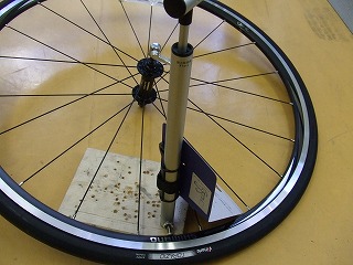 「ホイールを車体から外して地面に横たえ、ポンプ下に20mmくらいの厚みの石でもあてがってやればポンプに垂直に体重をかけて加圧する」ことができるのです(下写真)。