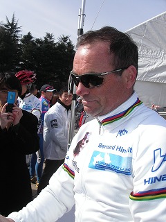 (50歳代にさしかかった往年の大スター、ベルナール・イノー氏。フランスで開催されている平和祈念レースのジャージーを着用している。)
