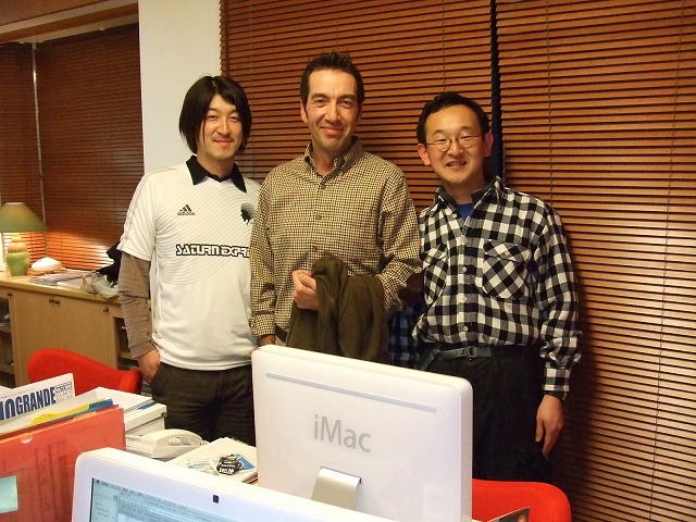 (部外秘?サイクリングタイムはこのオフィスで作られている・・・。デスクの資料にカワシマサイクルサプライ(問屋さん)の資料が入っているのが「いかにも」。人物は向かって左がエアリミックス竹本氏(チームのweb担当)、ヴァレンティーノ氏、ハイロード青山)