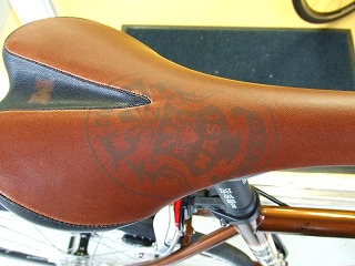 (渋い配色の「胴抜き」ペイント。サドルもオリジナルの紋章入り。)