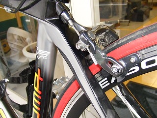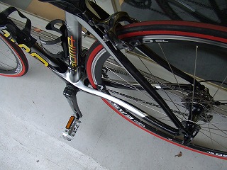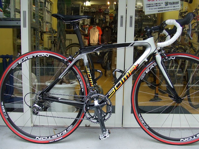 実際に載せて頂いた感想は、とにかく軽く(実測8kg以下でした)とくにフレーム後部が地面を蹴ってどんどん推進したがる感じです。この感覚には試乗車についていたBOMAのカーボン50mmリムのエアロホイールの性能も寄与していると思います。フロント周りはロードレーサーとして違和感のない特性を備えています。