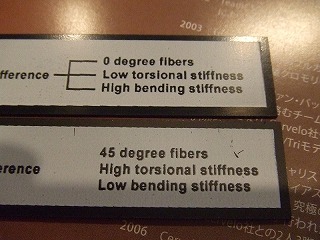 今回のセミナーでは簡単なカーボンサンプルが全員に配布されました(写真)。カーボン繊維が長軸に沿って配列されているものは捻れやすいが折れ曲がりにくく、繊維が45度に配列されているものは逆に折れ曲がりやすいが捻れに対しては強い、という事が体感できました。