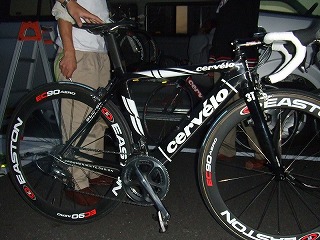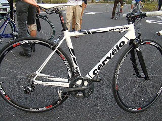 2009年サーベロ製品の目玉の一つがこのモデル。フルカーボンフレームセット(¥703,500税込)。前作P3を遙かに凌駕するという空力特性、リヤブレーキのエアロ化内蔵、ウォーターボトルをフレームに組み込む設計など斬新なアイデアと話題が満載のモンスターマシン。開発にあたっては1時間あたりでも莫大な使用料のかかる風洞実験施設をなんと8週間も使用して徹底したリサーチが行われ、開発費は総額1億円相当にのぼったといいます。