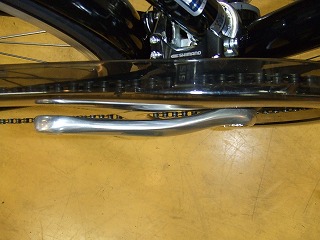 上の写真左はきれいに付けられたチェーンケース。前変速機も抱き込む大型ケースを使っています。このケースはボトムブラケットに共締めされる台座によって固定されていて、普通のスポーツバイクではまずこの部分が組み付けできません。写真右はケースとクランクを上から眺めたところで、クランクが外側に逃げてケースが入る空間が確保されているのが見て取れます。普通のスポーツバイクのクランクではケースにこすってしまって組み付けができません。オルビーのクランクは用途をとてもよく考えた部品選択だと思います。