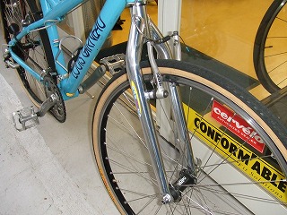 このフォークは、バズーカ・HCAL01フォーク(¥15,225−税込・工賃別)です。フロントフォークの交換はフォークの長さ(肩下寸法)が従来と大きく変化しないように気を付けないとハンドルの操作感覚がおかしな感じになってしまうことがあるので、注意が必要です。今回のフォークはこの寸法が430mmで、これまでついていたサスペンションフォークとほぼおなじになっています。