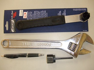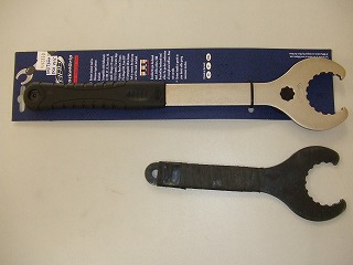 従来の工具構成だと、参考写真下のシマノ純正LR−15(これだけで¥1454税込)に加え、これを廻すモンキーレンチ(廉価なものでも¥2000程度から。しかもすごく重い)を用意しなければなりませんでしたから、費用もかさむし遠征時の荷物も重いしと不満がありました。BBBの製品はハンドルと専用工具先端が一体になっていますので軽量なだけでなく工具同士の滑り・脱落などの事故の危険も軽減されています。こちらも使いやすいグリップ付きです。
