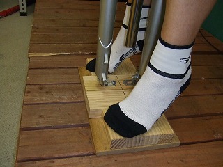 上記のように、ペダルの上の足の位置は非常に重要です。特に固定式ペダルの場合、靴にとりつけるペダルパーツ(クリート)の位置と向きを正確に決定することが必要です。このクリート調整作業は地味でありながらポジション決定の基礎となる重要な作業です。また少しの変位・誤差でも膝など関節の違和感や障害につながりやすいだけにできる限り精度の高い作業を提供したいと考えています。