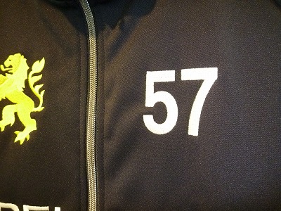 襟と袖口のジャージあしらい、および胸と背中の大きな刺繍がレトロな雰囲気を醸し出しています。このデザインの時代ですとジッパーは本来金属製だったはずですが、金属の光沢を活かしながらウェアとしての機能を高めるためにYKK製の最新メタル調ジッパーを採用するなど細部に渡って細やかに作り込まれています。