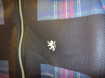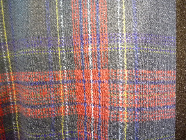 レッド系の柄は伝統あるハリスツイード生地の実物を撮影してこれを元に起こしたデザインで、本格的で落ち着いたイメージを作り出しています。姉妹品のパープルでは胸に横一文字の黒い切り替えだったのに対してこちらのレッドでは十文字になっていてデザインも違えてあります。
