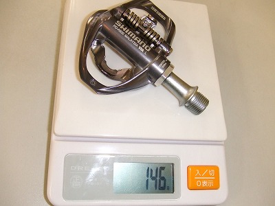 いままでこのような用途によく使われていた最高級MTBレース用ペダル「PD−M970」がペアで重量325g(=一個だと162.5g。公称)だったものが、今回のPD−A600だと実測で一個146g、ペアになると292gですから33gの軽量化となります。普及品のPD−M520(当店の定番)と比較すると88gもの軽量化です。