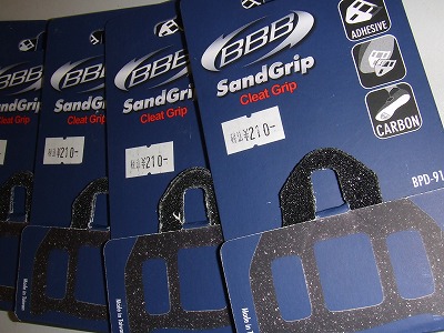 カーボンソールのレーサーシューズでは、硬いソール面にクリートが滑ってしまいうまく固定出来ないことがあります。紙ヤスリに粘着剤を付けたこの「サンドグリップ」をクリート裏に貼ってからボルトで固定すると、ヤスリ面が強力にソールに食い込み、微妙な位置決めもがっちり決まります。