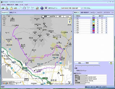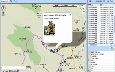 さらにGPS情報を刻々と記録させておく(ログを取る)ことができます。この記録(ログ)を専用のソフトウェア(「アトラスツアー」。メーカーサイトより無料提供)で読み出すことで、走った軌跡をパソコンのグーグルマップ上で簡単に見ることができます。しかもこの記録にみちみち撮影しておいた写真を取り込んで地図に写真をちりばめた旅日記をつくって自分で楽しんだり、さらにこれをウェブサイトに掲載できる形式に変換することもできるのです。