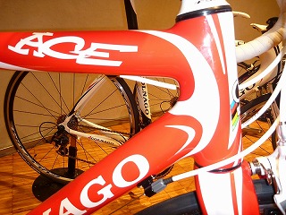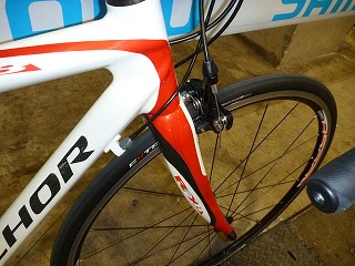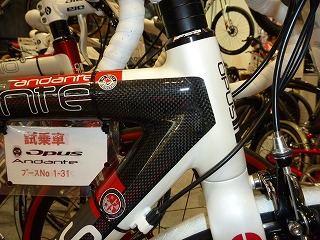 「アンダンテ」(”歩くように”)と名付けられたこのバイクはその名の通りレーサーと言うよりはロングライド、サイクリングバイクとして設定されており、登坂で無理がないようにロードとしては異例なほど軽いギヤを標準装備しています。またこの贅沢にも名門マビックの完組ホイール「アクシウム・レース」を搭載しているのもこの価格を考えるときわめて異例といえます。