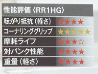 「RR1HG」はSLとは逆に、「RR1X」の性能をよりハイグリップな方向へ発展させたものです。レースを完走して結果を出さねばならないレースライダーにとっては、雨や悪路といった厳しいコンディションでも滑ったりしない安定性がタイヤの性能としてはむしろ求められるといいます。そこで「RR1X」のトレッドラバーをよりハイグリップな材質に変更したのがこの「HG(ハイグリップ)」です。