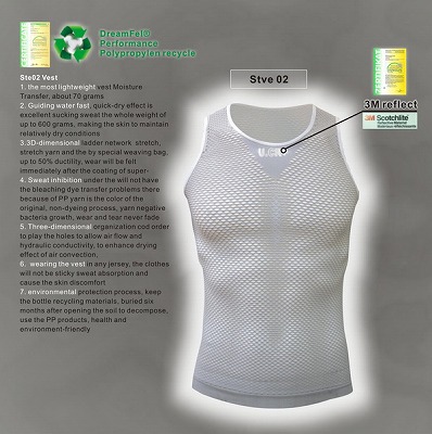 この「Ste02ベスト」は同じく台湾のTriOcean Textile Co. Ltd.の製品である「DreamFel」という繊維を混紡して作られています。この繊維は100%ポリプロピレンでできており、超軽量で繊維自体は吸水せず、これで作った衣料品は素肌から外部へ水分を排出して体をドライに保つ特性を持ち、また繊維自体の熱伝導性が低いので寒い環境で体熱を衣服内に閉じこめて体を冷やさない特性があるといいます。(繊維についてメーカー説明はこちらから(別ウィンドウ・英語))。