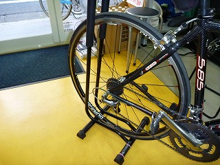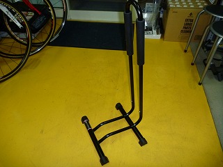 今回新規導入したこの「KP449A」は、二本の柱の間に自転車の後輪を差し込むだけで立てかけられ(上写真右)、見た目より遙かに安定して駐輪できます。ハイロード店頭に早速ひとつ設置してお客さんのバイクの駐輪に使ってもらっています。タイヤが太い場合でも柱のパッドを下にずらしてしまえば問題なく駐輪できます。