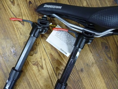 (右はサドルを付けたところ。赤いレバーを引き上げるとサドルが沈む)