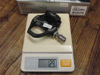 ペダルボディがアルミなので重たいといわれていたシマノですが、先日デュラエースをカーボン化し、本日入荷のアルテグラカーボンも揃って完全に汚名を返上しました。このアルテグラは実測片側129gという軽さです(写真)。レースペダルの新定番となるべき一品です。