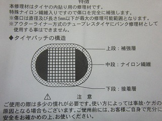 何とも長くて要を得ないネーミングですが、要するに今までのパンク修理パッチがチューブに貼るものであったのと異なり、タイヤの内側に貼ることができるパッチのセットです。ナイロン繊維入りなのでタイヤにかかる内圧に耐えて裂け穴をふさぐことができます(クリンチャーの場合チューブが穴からはみ出るのを防ぎます)。またTLであれば気密性を回復します。