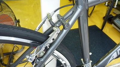 (700x28Cタイヤにマウンテンバイク用ブレーキ装備。キャリア台座もついている)