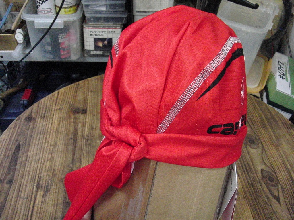 吸汗速乾生地のヘッドウェアです。とても薄くしなやかな素材で、肌触りがいいだけでなくヘルメットの中が暑くなったり窮屈になったりしにくいモデルです。後ろに「垂れ」があって海賊バンダナ風のスタイルになるとともに首筋を直射日光からガードしてくれます。