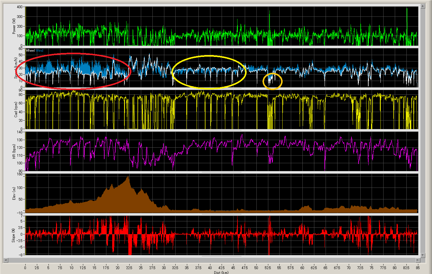 上図はNEWTONによる走行記録です。上から2段目の白いグラフがスピード、青い線は風速です。左端のスタートから序盤の峠の頂までずっと向い風だったことがわかります(赤丸部分)。この風は思ったより強かったみたいで、区間平均で8km/h(約2.2m/s)の向かい風ですから少しペダルが重くなるくらいだったことがわかります。