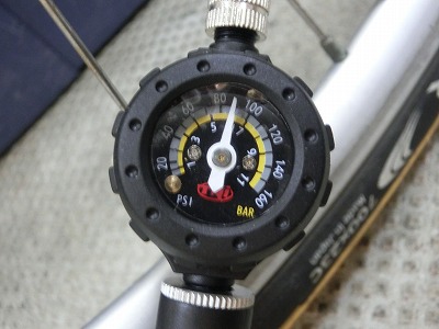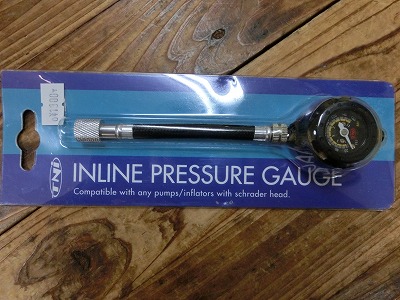 今回のテストには同じTNI製のインラインプレッシャーゲージ(\1300税別。下写真)をつないで使用しました。この製品はポンプが米式バルブ対応でないと接続できないのでさらに別製品の延長ホースをアダプターとして使用しました。上写真の品は当店オリジナル品「ホースエイド」(別ウィンドウにて)。800円強の同等品(ポンプアダプター)もグランジから発売されています。