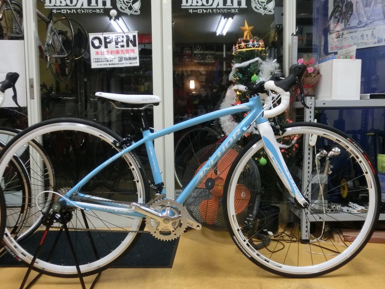 今回のYさんが真っ先に不安に思っていたのは「車輪の大きなバイクをまたいで立った時にちゃんと足が地面に届くかどうか」ということでした。公道で走るスポーツバイクでは安全第一、そのためには安心して乗れることが必須です(安心、安全)。そこで当店特製のシミュレーターバイク「ハイロード4号」を仮に調整して実際に店の前を走ってみてもらいました。ハイロード4号は日本の誇るバイクブランド「ブリヂストンアンカー」の一番小さいサイズのバイクをベースに制作したもので、とりわけ小柄なライダーが安心安全にロードバイクに乗れるかどうかの見極めに役立ちます。