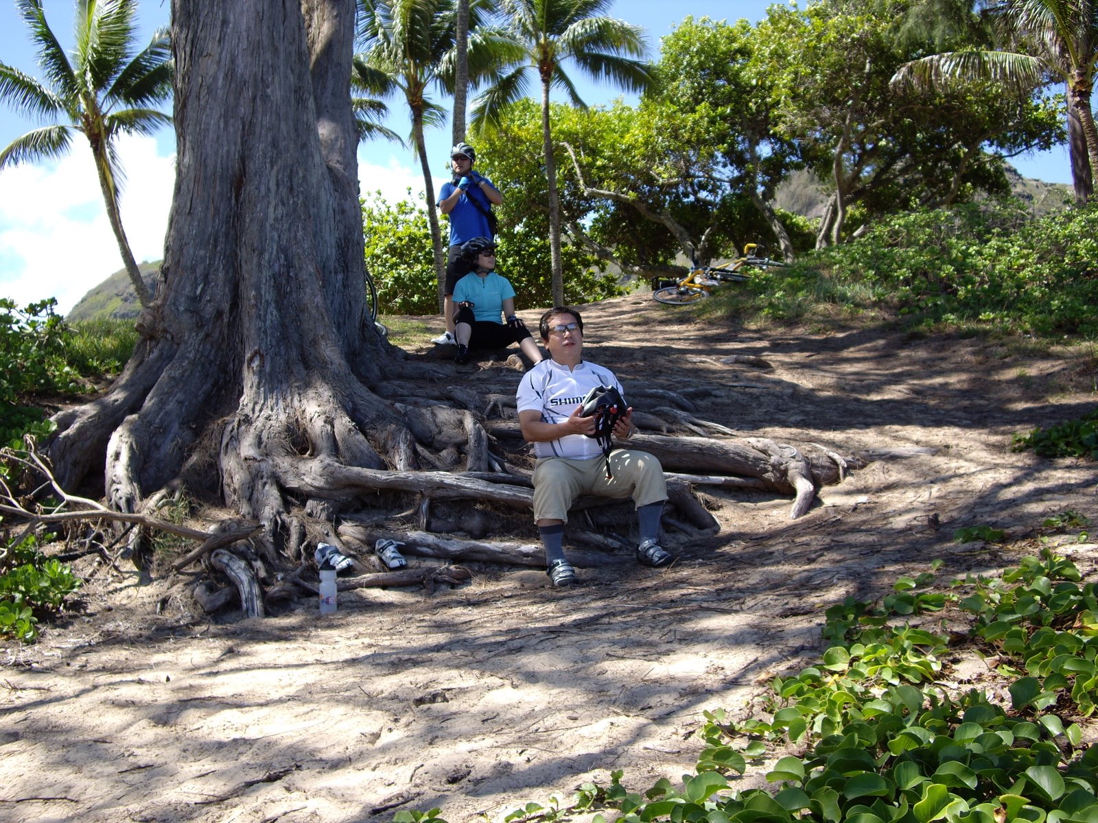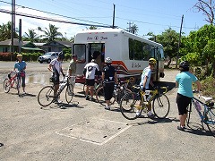 8時25分、オーシャンリゾートで4人を収容して発車。一路カアアワKa'aawaの100マイル折り返し地点、スワンジービーチパークヘ向かう。ライドでは走らない内陸ルートのドライブで、熱帯の緑が目にまぶしく、目新しい景色もうれしい。途中からライドのコースに入り、一同明日の予習もできた。