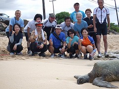 ノースショア沿岸を南下するルートをドライブ。ハレイワにゆく途中、ラニアケアLaniakeaビーチで野生のウミガメの昼寝を見物した。これは出発前に仲間のMさんが提案してくれた企画で、ちょうど一匹の80センチほどもあるウミガメが昼寝しており一同大喜び。駐車スペースは混雑していたがドライバーのサトウさんの計らいでスムーズに乗降できた。