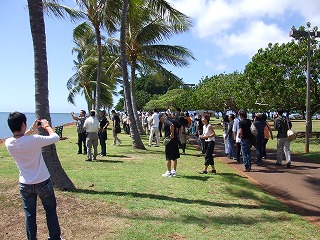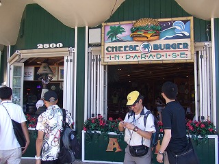 そこで12時ちょっと前にワイキキビーチでバスを降ろしてもらい、仲間でお昼を食べにゆきました。ハイロードでは毎年恒例の「チーズバーガー・イン・パラダイス」です。巨大なバーガーに腹ぺこの一同でかぶりつき、満足。食後はビーチを散策しながら三々五々ホテルに向かいました。ホテルはワイキキエリアのちょうど反対側のはずれにあるので、20分ほどのほどよい散歩になりました。13時前にホテル到着。