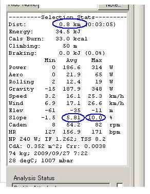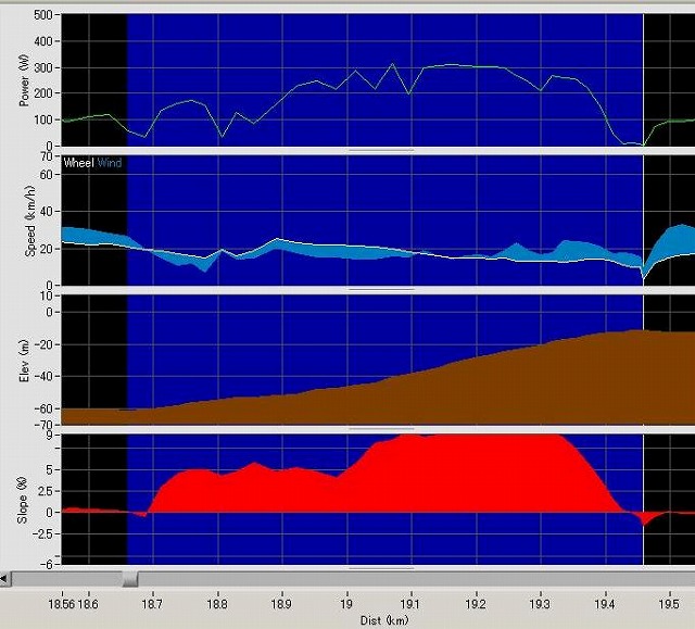 いよいよ難所「ハートブレークヒル」の下にさしかかったのが7時22分、18.7km。今回はパワーと傾斜を測定・記録できるサイクルメーター「iBikePro」を使ってこの急坂のデータを取ってみました。