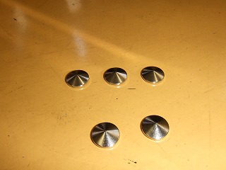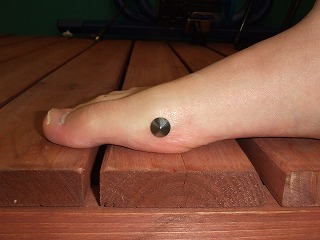 上記1)の作業のために用意した円錐状の金属小物「リベット」を、先に発見した拇指球の内側、足の側面に両面テープで固定します。