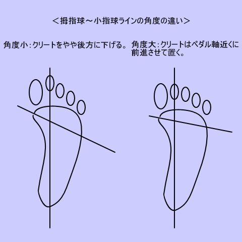 同じ理由で、拇指球と小指の付け根(小指球)を結んだラインと足の中心線(かかとの骨の中心と人差し指付け根とを結んだライン)とのなす角度が鋭角に近い人ほど(小指が後ろへ下がってついているいる人ほど)、クリート位置を後ろ気味に設定しています。