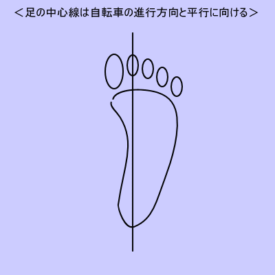 ※ペダル回転軸真上に拇指球をおくべきだという研究もあるが当店では従来使われてきた「若干拇指球を前に置く」やり方をとっています。これは足のアーチ構造とその機能、およびより効率的な動作方法についての考察(運動理論)に基づきます。詳細略。