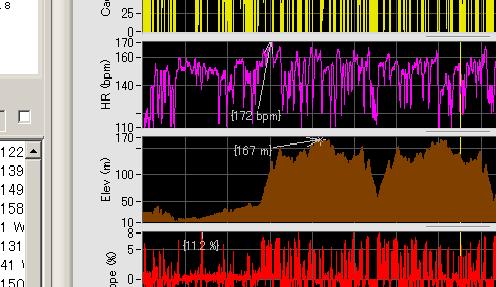 最近まで気づいていなかったのですが、iBikeソフトウェアの便利な機能として"Zoom In"があります。走行データの一部だけをドラッグして選択し、右クリックメニューで"Zoom In"とすると選択した区間だけが拡大表示されます。"Zoom