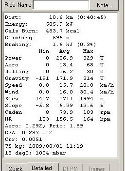 iBike2ソフトウェアでは、プロファイル(各iBikeおよび乗り手・バイクに固有の、より精度よくパワーを算出する為の基礎データセット。乗り手が自作する。こちらの過去記事を参照ください。)を使用してデータを解析・精度向上処理することができるのですが、この処理をした場合とその前の状態をワンタッチで比較できる機能がついています。これを今回のデータで使ってみると、解析処理後は206W程度になるパワーが、解析前の状態だと182Wくらいにしか表示されないという、大きな差が出ました。