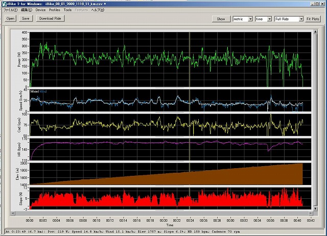 上の表は生のデータを「プロファイル」を利用して解析処理した後のものです。ここでは平均パワーは206.9Wと出ています。