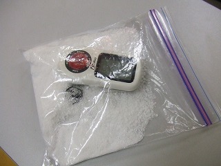 水没後4〜5日 干しておいても液晶についた曇りがなかなかとれないので、プラスチック袋にタンス用除湿剤の中身(吸水してゲル状になるという粉末)と一緒に密封してさらに除湿をすすめました。蓋を外した電池ボックスと風圧センサーの二つの開口部から粉末が侵入すると別のトラブルになりかねないので、これらの開口部はティッシュペーパーで覆っておきました。