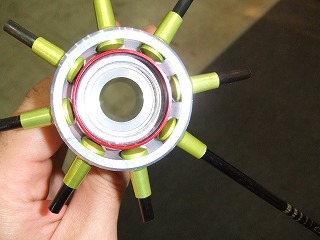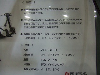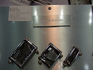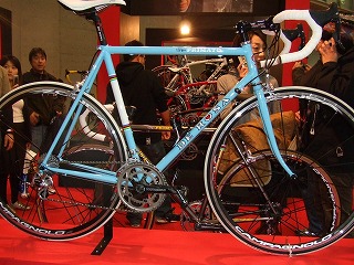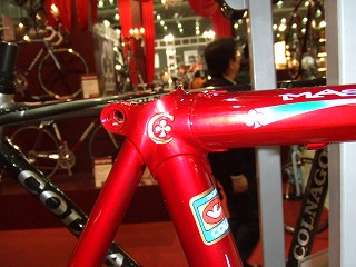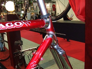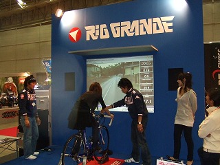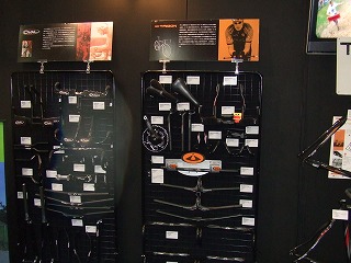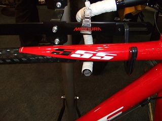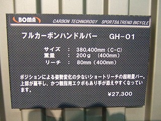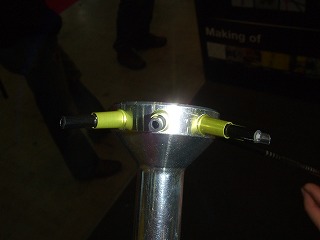ブースの係員が他のお客さんと話しているすきに別の見物のオニイサンがホイールを横から斜めからごりごりと床に押しつけて剛性を試していて、見ているこちらが「ああ〜こわれてゆく〜」と恐かったです。でも壊れなかったのかな?カーボンスポークは中空で、見た目相当華奢な感じ。落車したときがやや心配ですね。