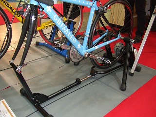 サンエスのブースで出会ったお客さんのMさんに導かれてついてゆくと、ジェイミスのブースにこれが!そもそも3本ローラーというのはバランスが難しくてなかなか上手に乗れません。自分は学生時代の合宿中に体調を崩して外に出られなかったさいに半日プロ用の三本ローラーに乗り、その結果バランスをとろうとして膝に負担がかかりつづけて膝を壊しました〜、という苦い思い出があります(トラウマ)。